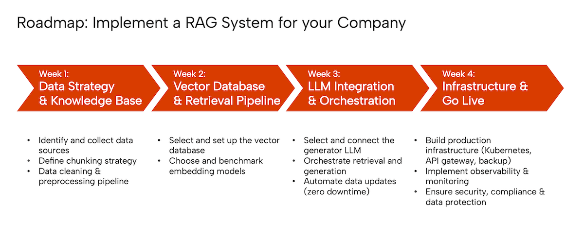 - Starte mit Woche 1 ernst: 70 Prozent aller RAG-Probleme entstehen durch schlechte Datenqualität, nicht durch falsche Technologie-Wahl