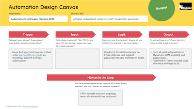 Unser Angebot für Firmen, die jetzt mit Automatisierung & KI vorankommen wollen. Das Starter Pack umfasst wertvolle Tipps, Templates, Prompts & ein Automation Design Canvas zum erfolgreichen planen deiner Automation-Projekte.